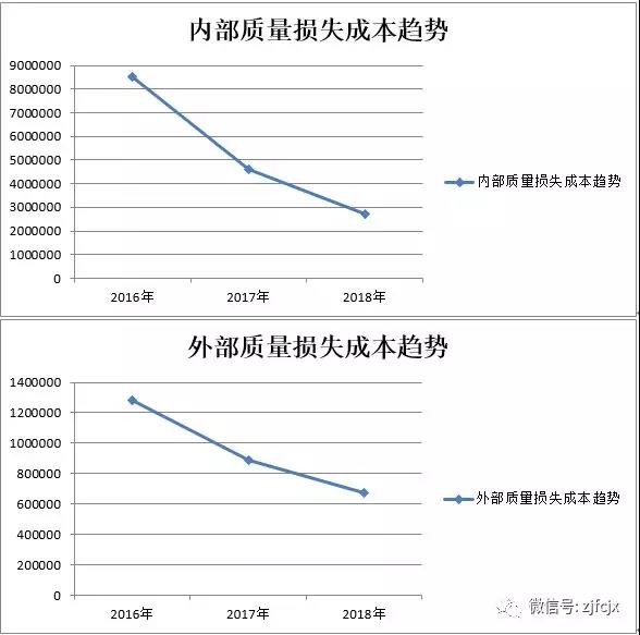 在2017年建立公司質(zhì)量成本統(tǒng)計核算系統(tǒng)以來,質(zhì)量損失事件及不合格產(chǎn)品造成的質(zhì)量損失成本數(shù)據(jù)進行了有效的收集、統(tǒng)計、分析、匯總,2018年,質(zhì)量損失成本管理的持續(xù)化,及對質(zhì)量損失成本分析數(shù)據(jù)的有效應用,最終得到了豐厚的回報,根據(jù)質(zhì)量損失成本的排列圖分析,而確定的涂裝生銹、涂裝油點的改進;針對鈑金工藝的滾圈、擴口開裂的報廢損失的改進,最終使本公司的內(nèi)部質(zhì)量損失成本,由2016年的850萬下降到2018年的273萬;外部質(zhì)量損失成本由2016年的128萬,下降到2018年的67萬。